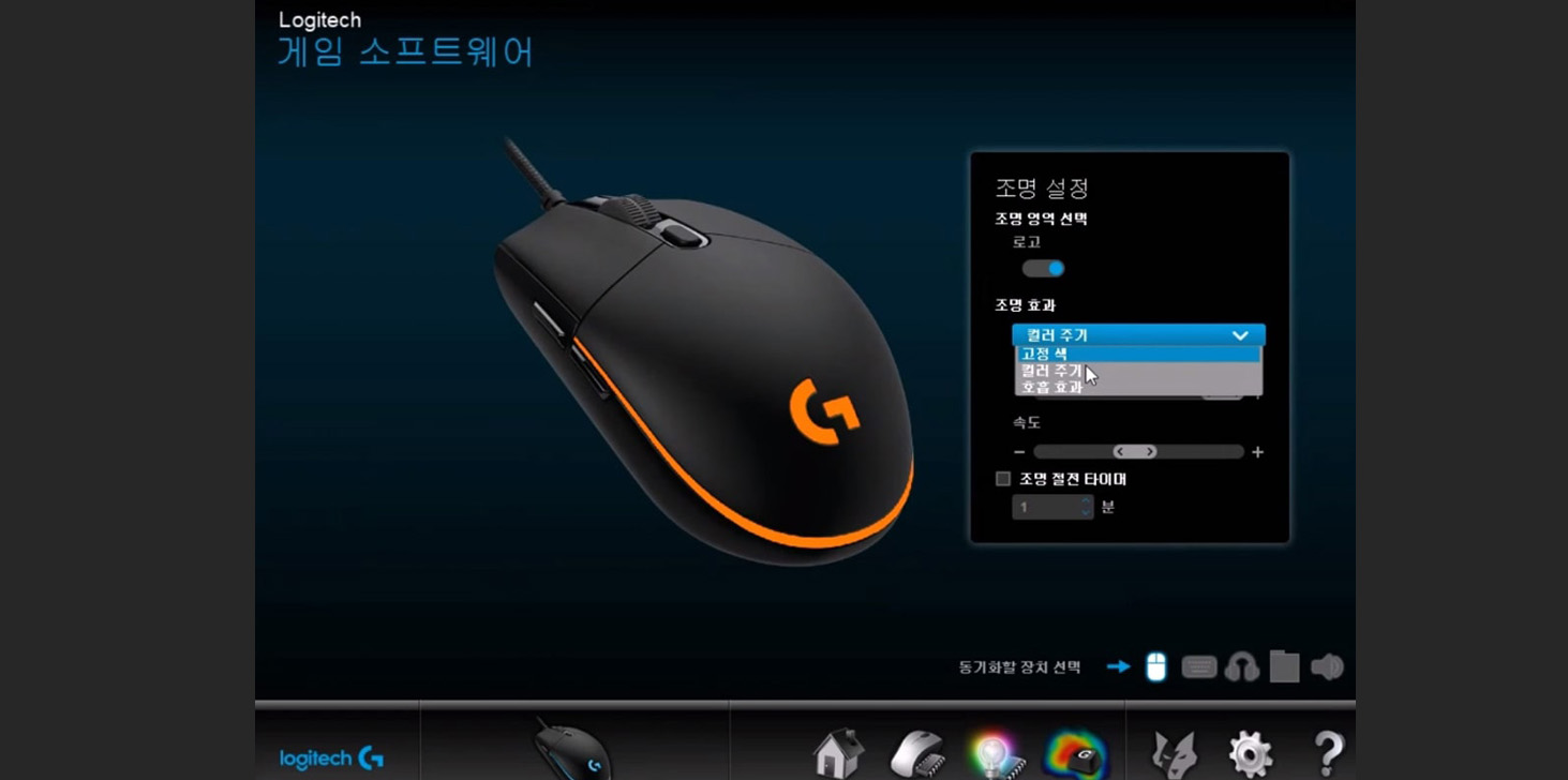 그리고 마우스옆에 전구모양 아이콘을 선택하게 되면 마우스의 조명설정이 가능합니다. 조명영역 선택에서 로지텍 로고의 조명 ON/OFF 설정을 할수 있으며, 조명효과 와 속도, 조명 절전 타이머 또한 설정할수 있습니다. 이상 간단히 설정 메뉴에 대해 알아보았습니다.
