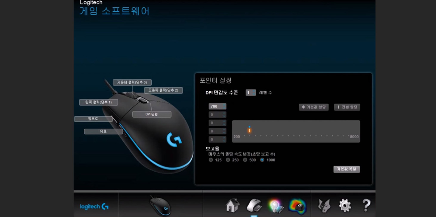 아래의 아이콘 모양 메뉴중 마우스 모양의 아이콘을 클릭하게 되면 DPI 민감도 수준을 조절할수 있습니다. 민감도는 자신에게 맞는 DPI를 설정한후 일일이 테스트하여 자신에게 맞게 조절하시면 됩니다.