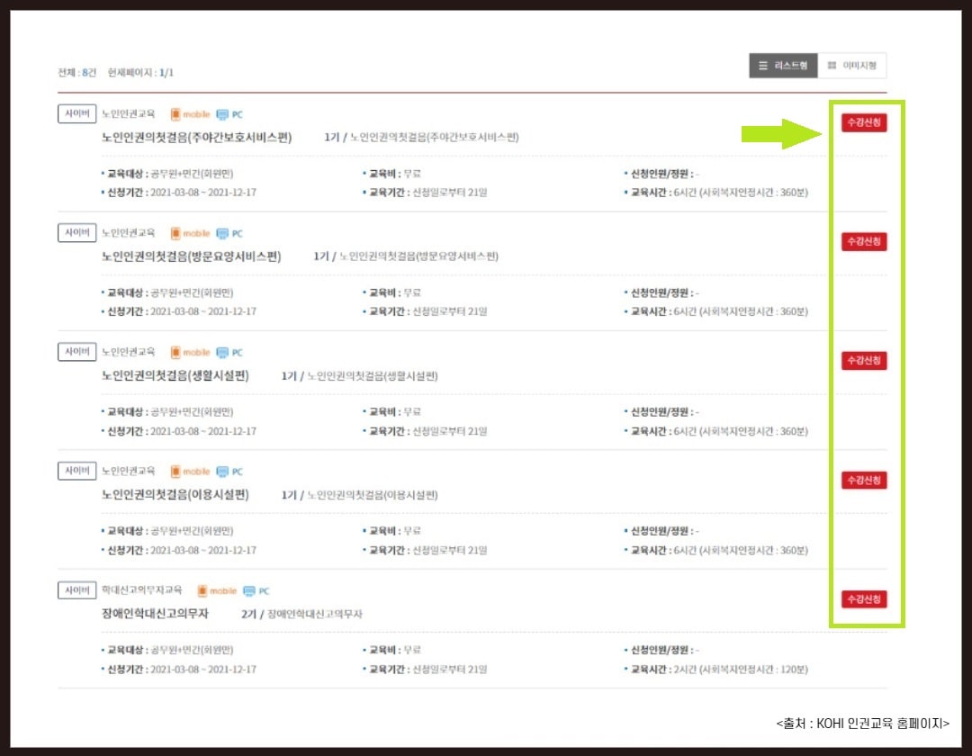> 노인 인권교육 과정이 나옵니다. 이 중 원하는 과정을 수강신청하시면 되는데요. 우선 모든 교육의 교육비는 무료이고 교육기간은 신청일로 부터 21일간 수강이 가능합니다.